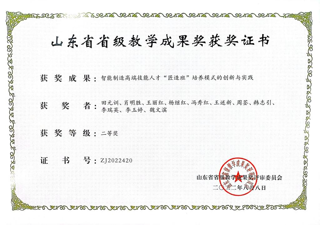 山东省职业教育教学成果二等奖-《智能制造高端技能人才“匠造班”培养模式的创新与实践》