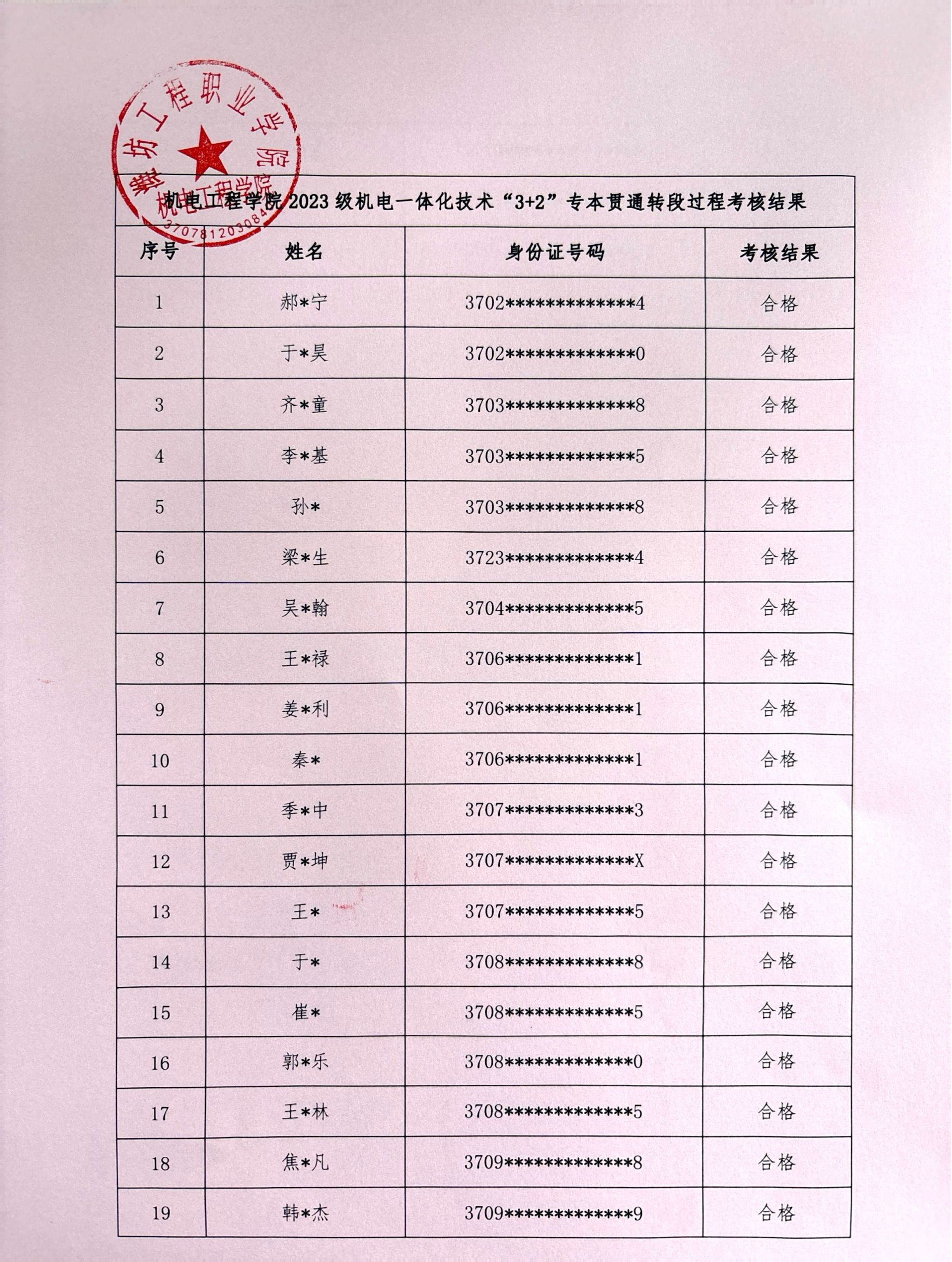 机电工程学院2023级机电一体化技术“3+2”专本贯通转段过程考核结果公示